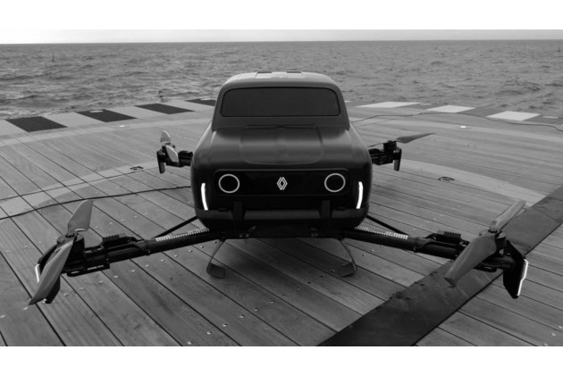 Zusammen mit TheArsenale (einem Spezialisten für ungewöhnliche Fahrzeuge, Yachten und mehr) präsentiert Renault eine schwarze Karosserie, die nicht auf Rädern, sondern auf Kufen steht und mit ihren vier Propellern wie eine Drohne in die Luft geht. Renault bezeichnet das Vehikel als "futuristisches Showcar", aber das ist es nicht. Es handelt sich um ein Luftfahrzeug.