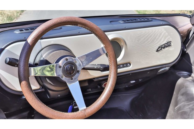 Die Tür lässt sich auf Wunsch auch per App öffnen. Der Systemstart erfolgt ebenfalls über das Handy, sodass kein Schlüssel mehr nötig ist. Innen hat das Auto eine schicke Retro-Optik mit einem Lenkrad, das auf den ersten Blick wirkt wie aus Holz, aber offenbar mit Leder bezogen ist. Dazu gibt es rustikal wirkende Metallspeichen. Außerdem gibt es einen schön altmodischen Evetta-Schriftzug am Armaturenbrett. Weniger passend sind die Lenkstockhebel, bei denen es sich offenbar um Standard-Plastikteile handelt.