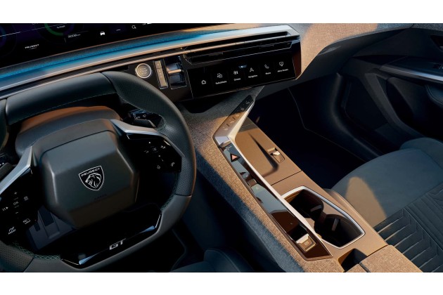Das kompakte Lenkrad ist seit jeher ein wesentliches Element des i-Cockpit. Es wurde umfassend überarbeitet und soll nun noch mehr Fahrgefühl, Komfort und ein moderneres Design bieten: Das neue Mittelteil ist kleiner und von den Lenkradspeichen isoliert, um einen Schwebeeffekt ähnlich dem Panoramabildschirm zu erzielen. Die beiden Bedienelemente am Lenkrad erkennen die Berührung durch den Finger automatisch, die Funktionen werden aber erst aktiviert, wenn sie gedrückt werden.