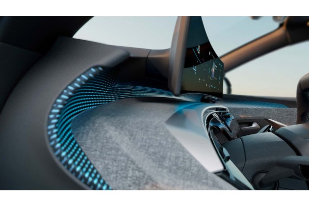 Der Panoramabildschirm steht auf einem Fuß, der vom Fahrgastraum aus nicht sichtbar ist, sodass er scheinbar über dem Armaturenbrett schwebt. Verstärkt wird dieser Effekt durch eine LED-Ambientebeleuchtung unterhalb des Bildschirms. Der Bildschirm ist zwar leicht zur Person am Steuer hin gewölbt, bleibt aber vom rechten Vordersitz aus sicht- und bedienbar.