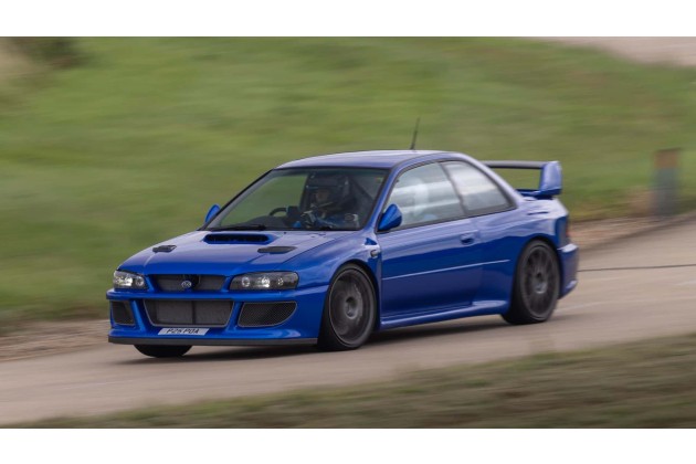 Es dauert jedenfalls nicht lange, bis man den Sinn dieses Restomods verstanden hat. Unter der Kohlefaserhaube des P25 steckt eine stark modifizierte Version des Subaru "EJ25" 2,5-Liter-Boxermotors mit Turbolader. Das Triebwerk wurde auf fast jede erdenkliche Art und Weise aufgerüstet - Pleuel, Kolben, Nockenwelle, Zylinderkopf, Einspritzdüsen, Ansaugung, Auspuff - um insgesamt 450 PS und ein Drehmoment von 660 Newtonmeter zu erreichen. Bei der Zündung wird alles mit einem ohrenbetäubenden Knacken und Knurren durch einen Akrapovic-Auspuff zum Leben erweckt.