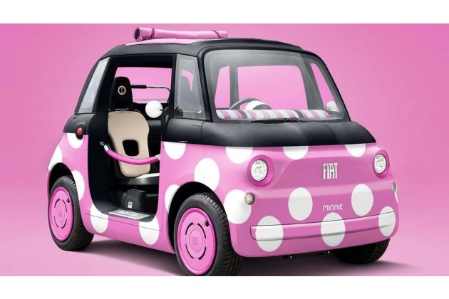 Wir beginnen mit dem Fiat Topolino mit roter Karosserie und schwarzem Dach, den Farben der berühmtesten Maus der Welt. Rosa mit weißen Punkten hat zwar auch eine gewisse Barbie-Note, doch das Fahrzeug steht für Minnie, Mickys ewiger Freundin.