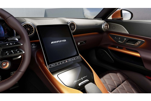 Die Manufaktur-Ausstattung umfasst handgenähtes Nappaleder "Mystic Red/Black" mit orangefarbenen Kontrastnähten im Innenraum. Diese Farbkombination findet sich auf den Sitzen, dem Lenkrad, der Armlehne, den mittleren Türverkleidungen und der unteren Instrumententafel. Das Fahrzeug verfügt über hochflorige Fußmatten mit gestickten AMG-Logos und einen verchromten "Manufaktur"-Schriftzug auf der Mittelkonsole.