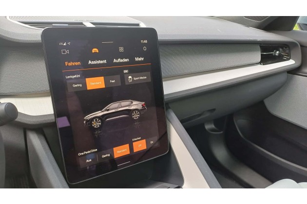 Schon auf den ersten Metern fällt die starke Rekuperation auf: Der Polestar 2 fährt standardmäßig im One-Pedal-Driving-Modus, der Kriechgang ist abgeschaltet. Anfangs bleibe ich an der Ampel fünf Meter vor dem Strich stehen - so stark ist die Bremswirkung. Doch bald bleibe ich länger auf dem Gas und schnell verliebe ich mich in diese Art des Fahrens mit nur einem Pedal. Einziger Kritikpunkt: Es wäre schöner, wenn man die Rekuperationsstärke per Lenkrad-Paddles einstellen könnte.