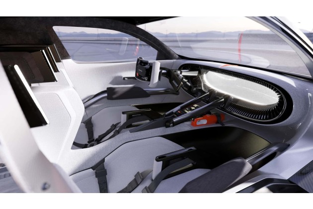 Obwohl das Concept 20-23 ein reines Showcar ist, haben die Design-Fachleute auch einen passenden Innenraum geschaffen. Durch die nach oben schwingenden Scherentüren gelangt man in ein Rennsport-Cockpit mit tief platzieren Schalensitzen. Diese besitzen sogar eine nach oben gerichtete Strebe auf Höhe der Oberschenkel - vermutlich, damit man sich in der Kurve besser abstützen kann.