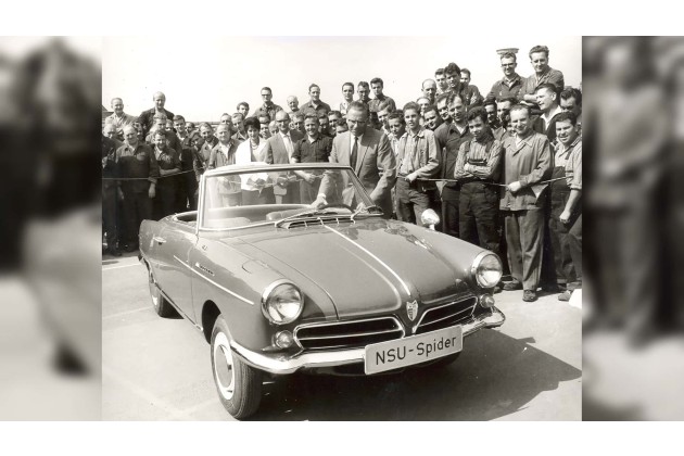 Im September 1963, kurz vor der Internationalen Automobilausstellung in Frankfurt, stand im Werk Neckarsulm für eine Stunde alles still. Der damalige NSU-Vorstandsvorsitzende Dr. Gerd Stieler von Heydekampf stellte den Beschäftigten den "NSU-Spider" vor, wie er damals offiziell hieß.