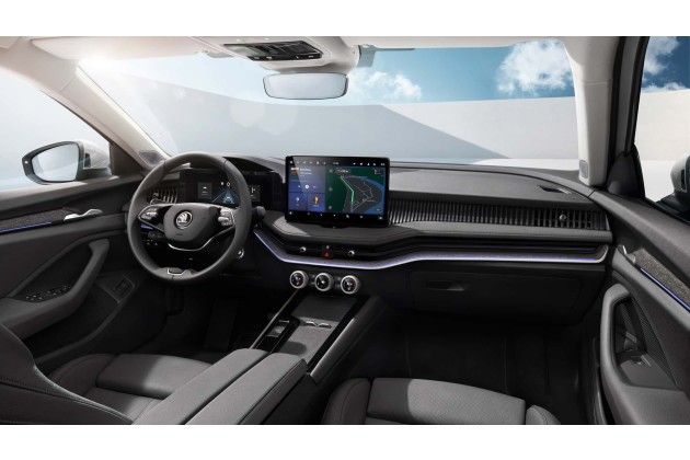 Während Skoda bei den Anpassungen des Außendesigns eher evolutionär vorgegangen ist, wurde der Innenraum komplett neu gestaltet, indem die meisten traditionellen Bedienelemente weggelassen wurden. Es gibt zwar noch den einen oder anderen Knopf für den analogen Zugriff auf Funktionen, aber die meiste Zeit wird man künftig am Bildschirm verbringen. Das Infotainment-System ist je nach Ausstattungsvariante 10 oder 13 Zoll groß, während das digitale 10-Zoll-Display hinter dem Lenkrad zur Standardausstattung gehört. Gegen Aufpreis wird für den Superb erstmals auch ein Head-up-Display angeboten.