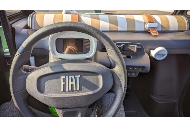 Unverändert bleibt die auf einem Rohrrahmen basierende Kunststoff-Karosserie. Immerhin schließen die mit Klappfenstern (wie einst bei der "Ente") versehenen Türen satter als erwartet. Entriegelt werden diese von innen übrigens mittels einer Zugschlaufe. Innen finden sogar lange Personen genug Beinfreiheit vor, jedoch ist die Frontscheibe weit vom Lenkrad entfernt. Wo sich sonst Ablagen befinden, bietet Fiat einen rundlichen Ziereinsatz mit nostalgischem Streifendekor an.