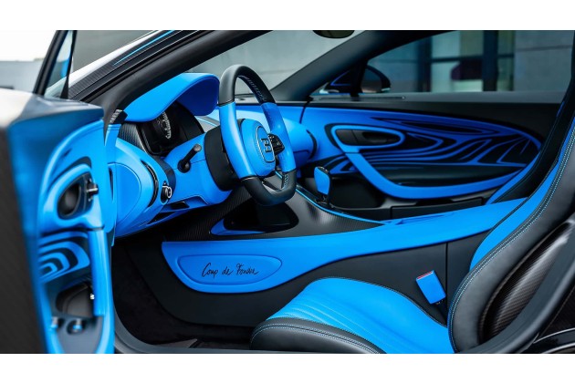 Auch die maßgefertigten Türverkleidungen mit dem einzigartigen, von den "Vagues de Lumiere" inspirierten Design wurden von Hand gefertigt und eingesetzt. Zum Abschluss wurden die Felgen von der ursprünglichen schwarzen Lackierung auf ein handbemaltes zweifarbiges Design in French Racing Blue umgestaltet.
