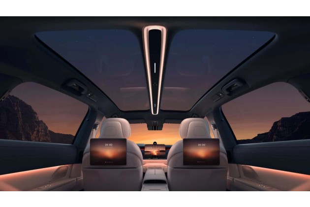 Im Inneren des Viersitzers gibt es vorne einen 15,6-Zoll-Touchscreen und zwei Bildschirme zum Video-Gucken im Fond. Dazu kommt noch ein 8-Zoll-Monitor oben auf der Mittelkonsole, die sich von vorn bis hinten durchzieht. Diese so genannte "Executive Bridge" bietet zudem ein ausklappbares Tischchen und einen kleinen Kühlschrank. Die Lehnen der Rücksitze lassen sich bis zu 45 Grad nach hinten neigen. Außerdem erwähnt Nio, dass es gleich sieben elektrisch bediente Sonnenrollos gibt. Zum "SkyRide"-Fahrwerk gehören Steer-by-Wire, Hinterradlenkung und eine "vollaktive" Federung.