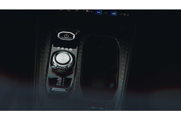 Die Bilder zeigen außerdem eine dicke blaue Linie, die sich von links nach rechts durch das gesamte Cockpit zieht und sich bis in die Türinnenseiten fortsetzt. Zudem gibt es rotes Ambientelicht in Gestallt zweier dünner Linien am oberen Rand des Armaturenbretts. In der Mittelkonsole gibt es neben dem Startknopf auch einen Drehwähler für die Automatik-Modi P, R, N und D sowie einen Schalter für die Fahrmodi Sand, Snow, Eco, Auto und Sport des "Selec Terrain"-Systems.