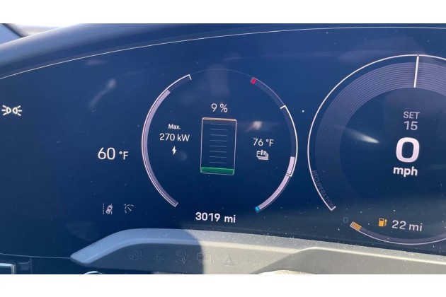 So entschloss er sich, den Tempomaten zu aktivieren und stellte ihn auf 65 Meilen pro Stunde (105 km/h) ein. Die Folge: Der erwartete Ladestand am Ziel wuchs allmählich auf 8, dann auf 11%. In der Nähe des Ziels drehte Patrick dann noch ein paar Extrarunden, um die Reichweite auszureizen. Nach 5h27 hatte er schließlich 274,2 Meilen zurückgelegt, und das Auto zeigte noch eine Restreichweite von 22 Meilen an.