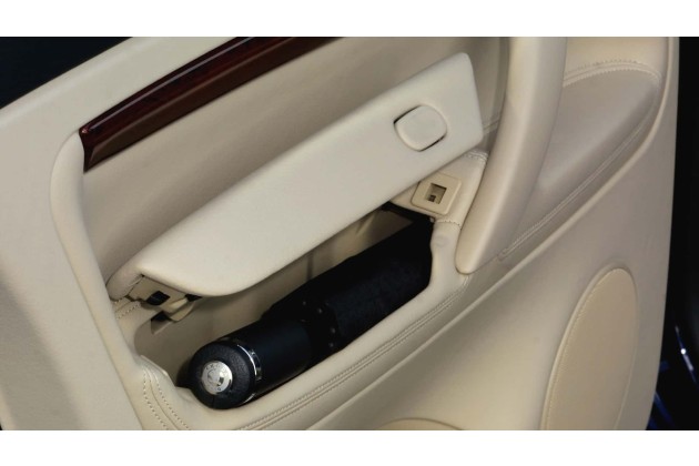 Ersterer befand sich hinter der Mittelarmlehne im Fond. Eine echte Staatslimousine, die tatsächlich auch der damalige tschechische Staatspräsident Vaclav Klaus fuhr. Davon haben wir ein Bild, ebenso von der Bein-Durchreiche (auf hellem Polster mit Stiefeln interessant ...) und dem Regenschirm in der hinteren Tür.
