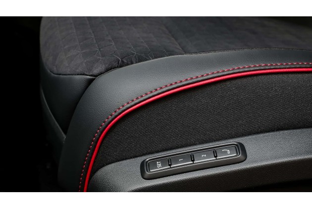 Vorne gibt es elektrisch einstellbare Sitze mit Memory-Funktion, die schwarzen Velours-Bezüge haben Rauten-Muster sowie rote Kontrastnähte und rote Biesen. Rote Nähte gibt es auch am Lenkrad, dazu eine rote Spange und einen GTX-Schriftzug: