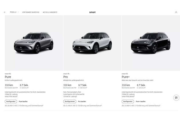 Zuvor waren die neuen Varianten bereits auf der österreichischen Website zum Smart #1 aufgetaucht (siehe Screenshot unten), wie MBPassion Ende Mai entdeckte. Wir berichteten damals und errieten auch die Preise richtig aus den Angaben auf der österreichischen Website richtig. Denn ist der Pure in Österreich 2.500 Euro günstiger als der Pro, der Pure+ dagegen um 2.500 Euro teurer als der Pro.
