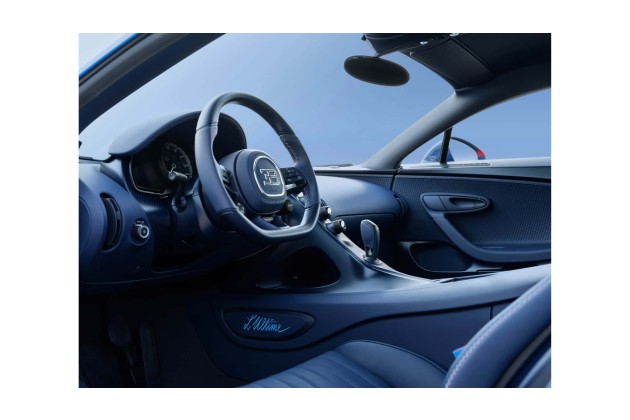 Die Verwendung des 500-Schriftzugs setzt sich nahtlos im Innenraum des Chiron fort, der ebenso individuell gestaltet ist wie das Äußere des Fahrzeugs. Hier entfaltet sich für Fahrer und Beifahrer eine Symphonie aus Karbonfasern, die das luxuriöse Deep Blue Leder und die Hightech-Veredelung Blue Carbon Matt mit Nuancen des legendären Bugatti French Racing Blue verbindet. Zu guter Letzt gibt es aufwändiges, handgeflochtenes Deep-Blue-Leder, das von Hand zugeschnitten, genäht und auf jede Türverkleidung aufgebracht wurde.