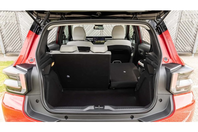 Gemessen am Kleinwagen-Format des ë-C3 ist das Raumangebot sehr ordentlich: 310 Liter Gepäck passen bei voller Bestuhlung ins Heck, leider ist die innere Ladekante recht hoch. Und nur in der teureren Ausstattung klappen die Rücksitze 60:40 um. Im Fond ist die Beinfreiheit akzeptabel, vorne kommen sich Fahrer und Beifahrer nicht in die Quere.