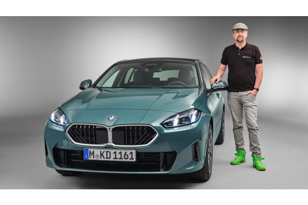 Generell ist die Frontpartie beim neuen 1er auffallend flach und deutlich tiefer zur Fahrbahn geneigt. Manch einer fühlt sich an den Kia Ceed oder Mazda 3 erinnert. Die serienmäßigen LED-Scheinwerfer verfügen über vertikale Elemente für Tagfahrlicht und Blinker nach Art des X1, aber auch M3 (nach Facelift) und 5er. Interessant ist die "Neue-Klasse-Falte" am BMW-Logo vorne.