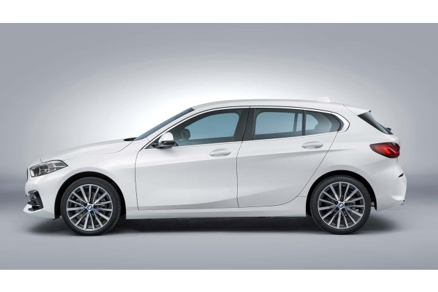 Die Seitenansicht des neuen BMW 1er erinnert noch am ehesten an das bisherige Modell. Markanter Unterschied beim F70 ist das Grafikelement mit der Ziffer 1 im Hofmeisterknick an der C-Säule. Dieses Detail kennt man vom neuen 5er. Unverändert sind die Türgriffe (keine Klapptürgriffe wie beim 5er) und der darunterliegende Knick im Blech entlang der Seite.