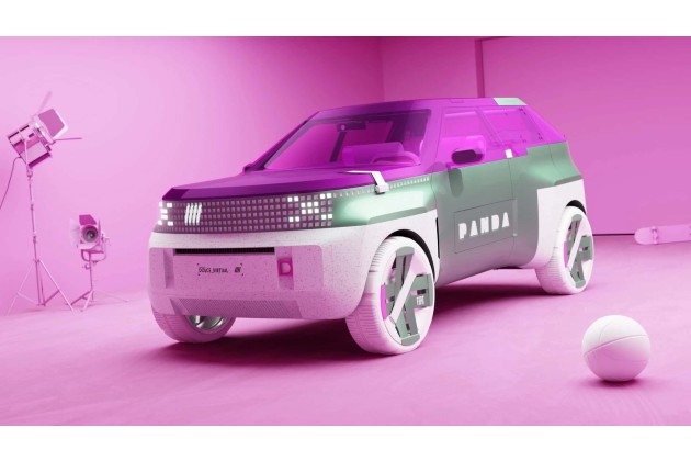 Auffallend ist besonders die Frontpartie: Orthogonale Linien umhüllen den quadratischen Kühlergrill. Der angedeutete Unterfahrschutz unterstreicht den robusten Charakter des neuen Fiat Grande Panda. Die Signatur des Tagfahrlichts besteht aus horizontalen Pixeln, die in einem Schachbrettmuster angeordnet sind. Das erinnert an die Studie vom Februar 2024.