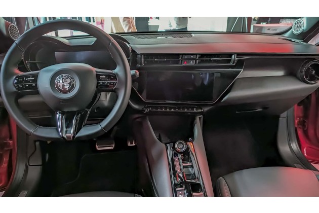 Was man schnell merkt: Das Kofferraumvolumen von 400 Liter geht in Ordnung, etwas einschränkend ist aber das betont schräge Heckfenster. Wir tasten uns vorwärts, im Fond wird es für Menschen ab 1,80 Meter recht eng im Fußraum. Deutlich bequemer ist die Situation auf dem Fahrerplatz: Viele echte Tasten und eine gute Ergonomie durch den zum Fahrer zugewandten 10,25-Zoll-Touchscreen. Er könnte aber gerne etwas höher montiert sein. Hartplastik ist durchaus sichtbar, je nach Version versucht Alfa aber, das Ambiente mit Alcantara aufzupeppen.