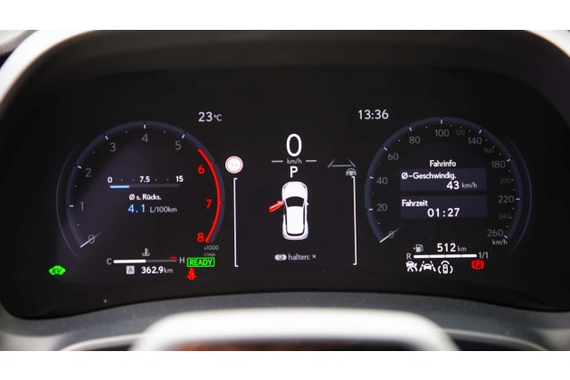 Die Kehrseite der Medaille solcher Fahrten ist der Spritverbrauch. Während sich der Lexus im Stadtbetrieb mit deutlich unter 5 Liter auf 100 km zufriedengibt und unter idealen Bedingungen sogar eine drei vor dem Komma erreicht, schnellt der Verbrauch auf der Autobahn schnell in ungeahnte Höhen. Zusammen mit dem winzigen Tank, der nur 36 Liter fasst, aber bei 28 Litern schon Null Kilometer Restreichweite anzeigt, ist die Pausenfrequenz fast höher als bei einem Elektroauto. Nur Nachtanken geht natürlich deutlich schneller…