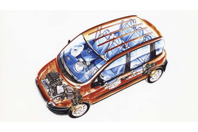 Der Fiat Multipla ist seinerzeit auch produktionstechnisch innovativ. Dank der Space-Frame-Struktur erfüllt er zwei Anforderungen: hohe Produktionsflexibilität und niedrige Investitionen in der Fabrik.