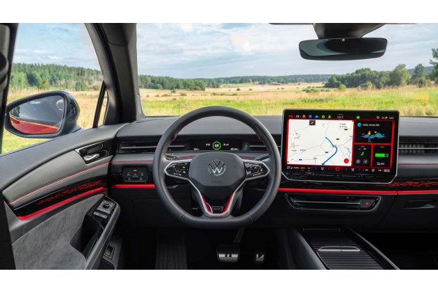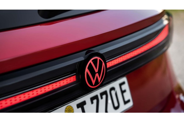 Insgesamt wirkt der Tourer dynamisch fließend und vor allem stimmig, weswegen die üppige Länge von knappen fünf Metern nicht großartig auffällt. Der ID.7 Tourer GTX kommt gerade in seinem dunkel gehaltenen Rot (eine Hommage an den GTI) mit schwarzen Akzenten noch einmal leicht fordernder daher. Stoßfänger, Lüftungsgitter, Tagfahrlicht, Diffusor und Felgendimensionen zeigen dezente Sportlichkeit.