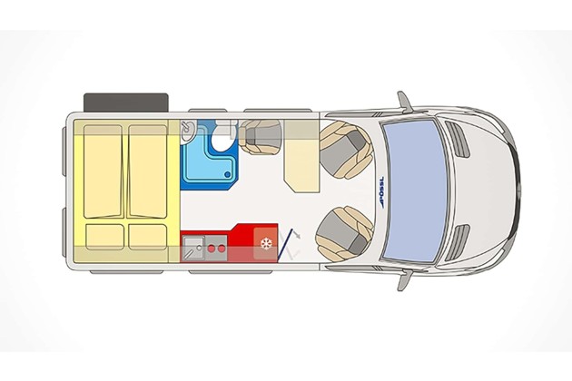 Hinter den Fahrersitzen befindet sich eine variable Sitzecke mit einem freischwebenden, verstell- und herausnehmbaren Tisch. Die Küchenzeile ist mit einem 70-Liter-Kompressorkühlschrank ausgestattet, wobei die Auszüge und Oberschrankklappen über eine Softclose-Funktion verfügen. Und natürlich gibt es auch ein Bad mit Toilette, wobei deren Besonderheit die Lamellenschiebetür ist, die den oft nervenden Duschvorhang überflüssig macht.