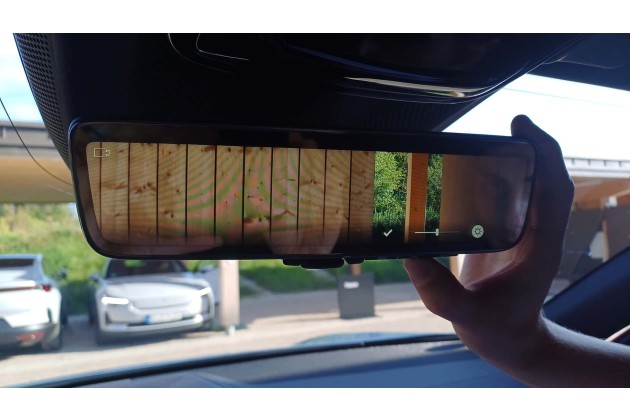 Der kamerabasierte Innenspiegel vom Spezialisten Gentex ist nicht schlecht: Die Kamera lässt sich in Blickrichtung und Helligkeit einstellen, zudem kann man auf einen konventionellen Spiegel umschalten, wenn man die Kinder im Fond im Blick behalten will. Ein perfekter Ersatz für einen normalen Spiegel und eine Heckscheibe ist das Ding aber nicht. So spiegelt er bei sonnigem Wetter und die Augen von Älteren (wie mir und meinem mitfahrenden Kollegen Rudi) haben Probleme, sich an die Nahumgebung zu adaptieren, wenn man vom Blick nach vorne auf den Spiegel wechselt.