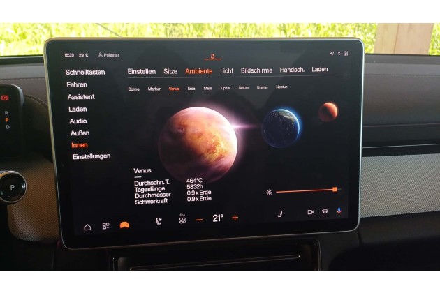 Die Farbe des Ambientelichts lässt sich steuern, indem man einen passenden Planeten am Touchscreen auswählt. So steht der Mars für Rot, die Erde für Blau und so weiter. Eine nette Idee, die zu Markennamen passt, denn Polestar ist der englische Ausdruck für den Polarstern.