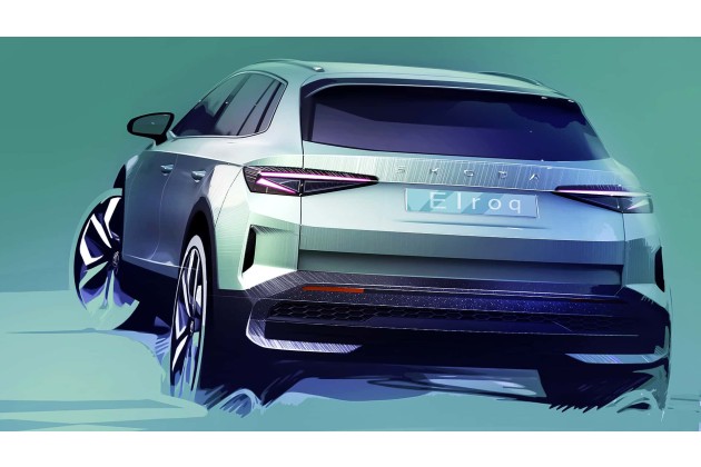 Nicht exakt in der Skizze wiedergegeben, aber von Skoda angekündigt, sind die dunklen Chromzierleisten und die exklusive Karosseriefarbe Timiano Green, die dem Elroq gewidmet ist. Die gleiche dunkle Chromoberfläche ist auch dem Skoda-Logo auf den Radnaben gewidmet. Hinten erinnert der Elroq ein wenig an den Fabia: