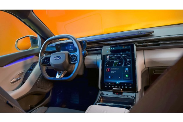 Neben dem kleinen 5-Zoll-Bildschirm des Kombiinstruments vor dem Fahrer befindet sich das 14,6-Zoll-Display des Infotainmentsystems, das um bis zu 30° geneigt werden kann. Es ist de facto die Kommandozentrale von Ford, über die sich alle Aspekte des Fahrzeugs steuern lassen, von der Sitzheizung und den Massagefunktionen bis hin zur drahtlosen Konnektivität mit Apple CarPlay und Android Auto.