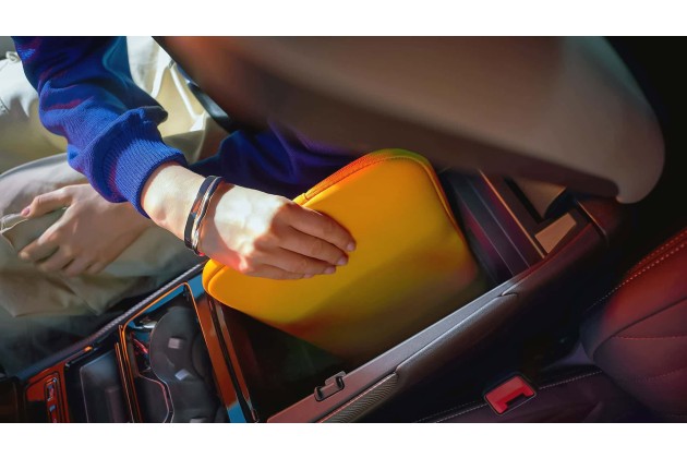 Das Display kann unter anderem um einige Zentimeter verschoben werden, um ein verstecktes Fach namens "MyPrivate Locker" freizugeben, in dem Sie kleine Wertsachen verstauen können. Unter der Mittelarmlehne befindet sich die MegaConsole, ein 17-Liter-Fach, das auch einen 15-Zoll-Laptop aufnehmen kann.