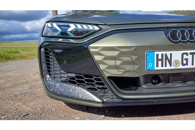 Mein RS e-tron GT Performance hatte eine olivgrüne Lackierung, die mich an das VW ID.3 Facelift erinnert. Ehrlich gesagt, mir wäre fast jede Farbe lieber gewesen als dieses Bedfordgrün Metallic, das mich ans Militär erinnert, zumal bei meinem Testwagen auch noch Carbonelemente in Tarnoptik hinzukamen: L-förmige Teile am Frontspoiler, die Außenspiegel-Kappen und die Zierleisten an den Schwellern. Zusammen bilden diese das Optikpaket Carbon Camouflage matt.