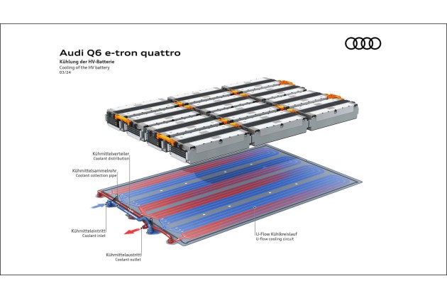 Aber die Führung der Kühlkanäle interessiert mich: Nach den von Audi veröffentlichten Schemazeichnungen sah es für mich so aus, als wäre sie bei den PPE-Modellen (Q6 e-tron und A6 e-tron) günstiger: Bei der J1-Batterie werden die Module, die in Fahrtrichtung links von der Mitte liegen, kälter sein, die rechts wärmer - fürs Laden nicht optimal. Bei der PPE-Batterie dagegen werden die Module gleichmäßig gewärmt/gekühlt. Dass die einzelnen Zellen der Zeichnung nach links gewärmt und rechts gekühlt werden dürfte wohl nicht viel schaden.