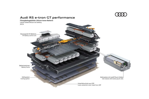 Statt einem 84-kWh-Akku wird in den Audi e-tron GT nun eine 97-kWh-Batterie eingebaut. Beim Topmodell reicht das für bis zu 592 Normkilometer. Der Energiespeicher besteht nach wie vor aus Pouch-Zellen. Prismatische Zellen, wie sie bei MEB-Fahrzeugen ersatzweise verwendet werden können, sind im J1-Baukasten nicht vorgesehen. Jeweils 12 Zellen passen in ein Modul, 33 davon stecken in dem Auto.