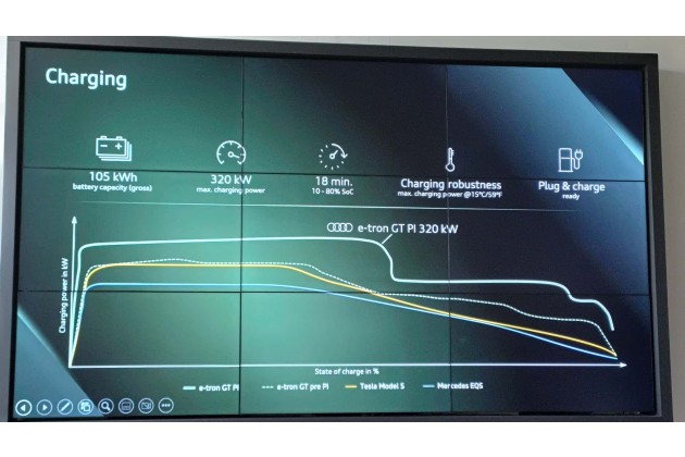 Wir fragten auch nach dem Schnellladen an der 400-Volt-Säule. Hier setzt Audi bei den PPE-Modellen auf das so genannte Bankladen, während die J1-Modelle einen Aufwärtswandler (Boost Converter) nutzen. Bei der Veranstaltung zum Q6 e-tron hieß es, das Bankladen würde zu weniger Ladeverlusten führen. Die Ingenieure, die für den e-tron GT zuständig waren, sagten mir, die Verluste durch den Boost Converter würden keine große Rolle spielen ...