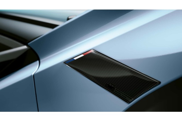 Die Kotflügel tragen offenbar schwarzglänzende Schutzleisten; auch der Schweller ist schwarz verkleidet. Ein weiteres schwarzes Element mit einer kleinen französischen Flagge verbindet die Kotflügelrahmen mit den Seiten der Windschutzscheibe. Was wir nicht recht deuten können, ist das Metallteil in Karosseriefarbe oberhalb dieser Flagge: