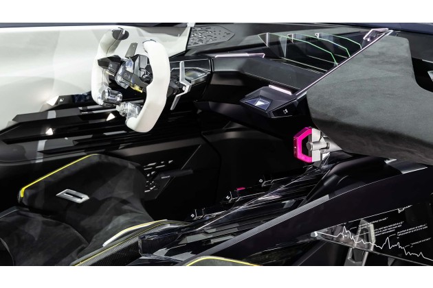 Als Kontrast zum farbigen Exterieur ist der Innenraum weitgehend in Schwarzweiß gehalten: Das Lenkrad und die Rückbank sind weiß, die Schalensitze und das Armaturenbrett schwarz. Die wichtigsten Fahrdaten erscheinen auf drei Glasscheiben hinter dem Lenkrad, die einen holografischen Effekt erzeugen sollen.