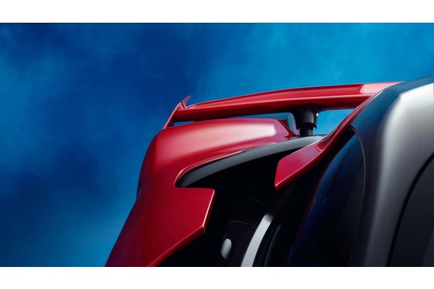 Dahinter befindet sich ein abgeschnittenes Heck, das zwei Konfigurationen aufweist: eine, bei der sich der Flügel in Ruhestellung bewegt, und eine, bei der er angehoben ist. Die Rückleuchten sind schlank, um einen Sandwich-Effekt zu erzeugen, während sich auf der Motorhaube sechs Lüftungsschlitze befinden, die der Anzahl der Zylinder des Verbrennungsmotors entsprechen.