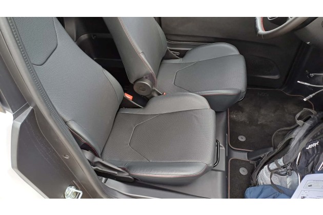 Die Sitze lassen sich längs verschieben, der Beifahrer kann sich also auch weiter nach hinten bugsieren. Zumindest beim Fahrersitz lässt sich auch die Lehnenneigung einstellen. Das ist auch die einzige Methode, die richtige Sitzposition zu finden, denn weder das Lenkrad noch die Sitzhöhe lässt sich justieren. Zum Lenken finde ich rasch eine gute Position, aber ich sitze sehr hoch im Fahrzeug und gucke auf den obersten Teil der Frontscheibe. Wer länger ist als 1,76 m wie ich, sollte probesitzen.