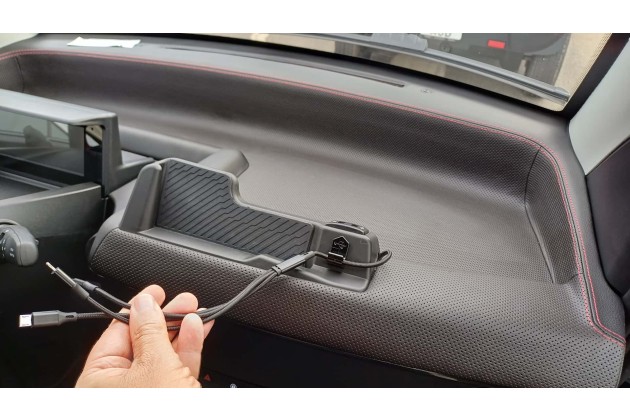 Ich gucke auf ein ziemlich großes Fahrerdisplay, auf dem der Ladestand zu sehen ist (in zwei Grafiken für die zwei Akkus), dazu die Restreichweite und das gefahrene Tempo. Außerdem gibt es noch eine Handyhalterung vor dem Beifahrersitz mitsamt drei Kabeln zum Anschließen; ich stöpsele mein Handy über den USB-C-Kabel an. Wer noch ein USB-A-Kabel hat, nutzt einen der beiden Anschlüsse daneben.