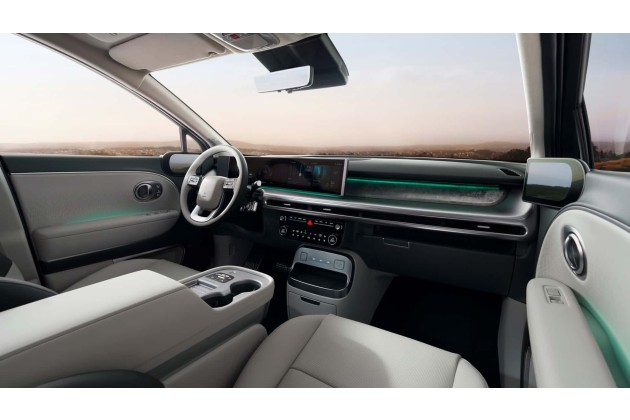 Innen gibt es eine ähnliche Cockpitlandschaft wie bei Ioniq 5 und 6. Sie besteht aus zwei nebeneinander angeordneten 12-Zoll-Bildschirmen für die Instrumente und das Infotainment. Ansonsten gibt es einen Sprachassistenten mit künstlicher Intelligenz; Android Auto und Apple CarPlay werden unterstützt, es gibt eine kabellose Lademöglichkeit fürs Smartphone, UBS-C-Slots (mit 100 W Ladeleistung) und so weiter. Auf dem Bild unten sind zudem die zwei Displays für die Bilder der Außenspiegel-Kameras zu sehen.