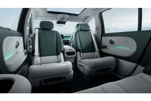Wie den EV9 gibt es auch den Ioniq 9 mit sechs oder sieben Sitzplätzen in drei Sitzreihen. Wie bei Kia können die Sitze der zweiten Reihe beim Sechssitzer können um 180 Grad gedreht werden, damit man sich im Fond gegenübersitzen kann. Über der Kabine gibt es ein Glasdach, möglicherweise ein Schiebedach.