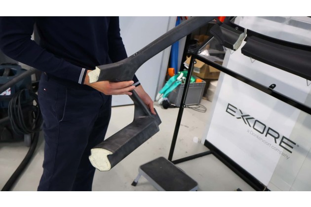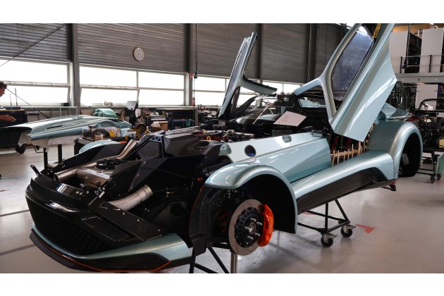 In der Folge wird aus den Gittern und einigen Rahmenteilen das eigentliche Chassis. Letztere werden im von Donkervoort erdachten Ex-Core-Verfahren erschaffen - ebenso wie alle Karosserieteile. Grob erklärt, dehnt sich ein Schaum im Inneren der Form aus, um so die Carbonlagen von innen nach außen zu pressen. Das spart Arbeitsgänge, Kosten und CO2, bei einem gleichzeitig besseren Verhältnis von Steifigkeit zu Gewicht. Zudem seien komplexere Formen möglich.