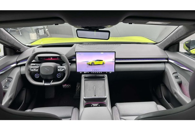 Im Cockpit gibt es einen 15,6-Zoll-Touchscreen, ein kleines Display vor dem Fahrersitz sowie ein großes Head-up-Display. Das Lenkrad ist oben und unten abgeflacht. Eine Besonderheit sind die Touchpads an den Türinnenseiten, deren Funktion sich konfigurieren lässt. So kann man damit entweder das Handschuhfach öffnen, die Leselampen oder die Sitzheizung aktivieren.