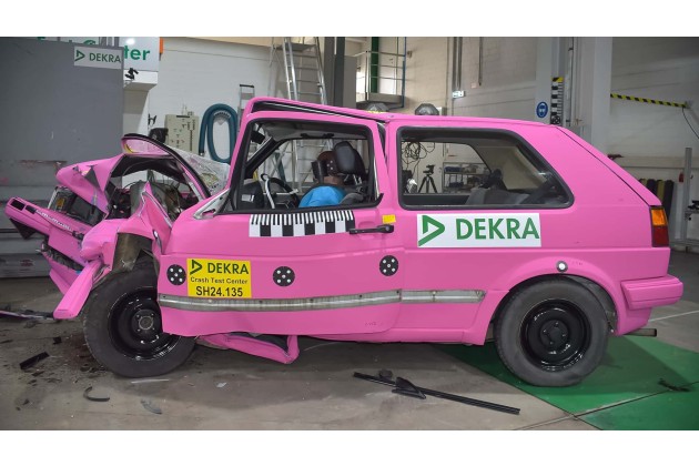 Ein zentraler Vergleich erfolgte zwischen einem VW Golf II (Baujahr 1989) und einem aktuellen VW Golf VIII (Baujahr 2024). Beim Crashtest in Neumünster wurde der ältere Golf nach dem bis 2020 gültigen Euro-NCAP-Offset-Frontalcrash geprüft: Mit 64 km/h prallte das Fahrzeug zu 40 Prozent überlappend auf eine Barriere, die mit einem Deformationselement ausgestattet ist.