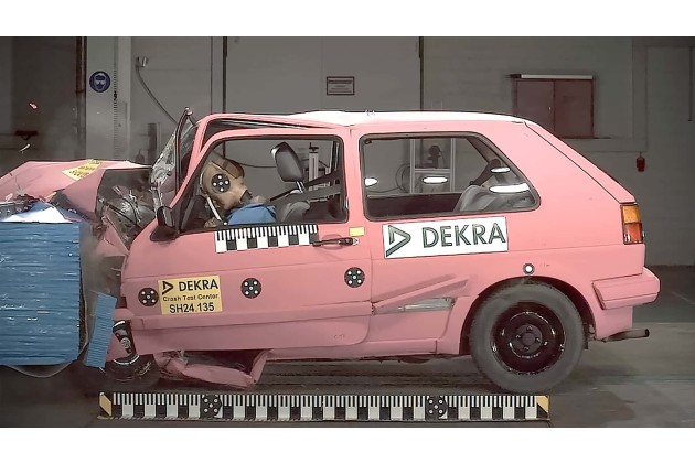 Sehen Sie den armen VW Golf II dort oben? Er musste sein Leben aushauchen, um die Fortschritte in der Entwicklung der Fahrzeugtechnik zu zeigen, die seither maßgeblich zur Verbesserung der Verkehrssicherheit beigetragen haben. So wollte es die Prüforganisation Dekra.