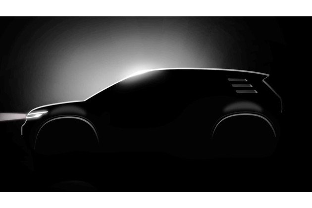 Zu sehen ist ein recht knuffiges und ziemlich breites Auto mit deutlichen SUV-Merkmalen wie einem bullig wirkenden Unterfahrschutz und dicken Kratzschutz-Leisten an den Radläufen. Außerdem hat das Auto vorne eine durchgehende Lichtleiste, große Räder und eine Dachreling.